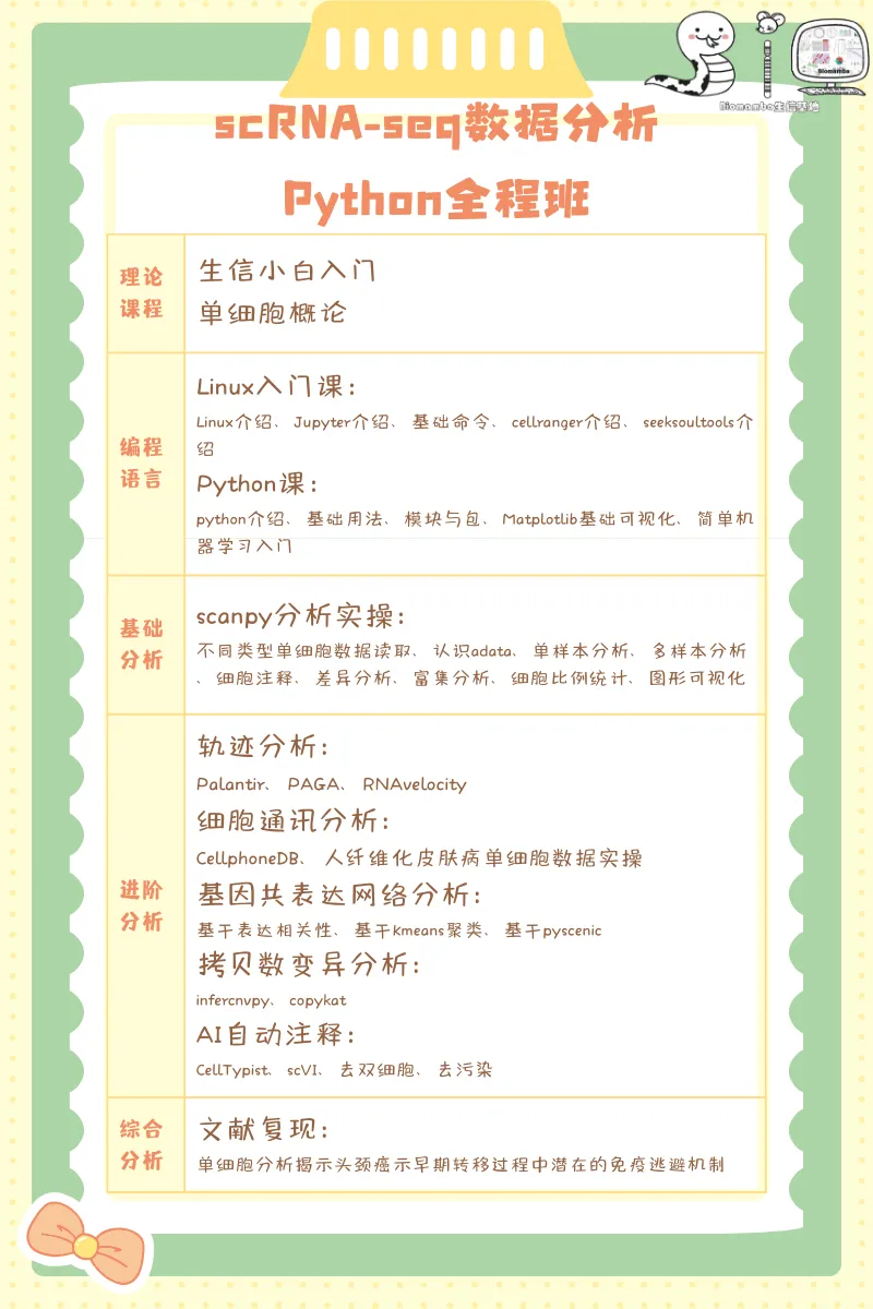 ✅ 零基础友好:82小时「编程基础 + 分析工具 + 文章复现」循序渐进,直击scRNA-seq核心流程(基础分析→多样本整合→可视化→轨迹分析→细胞通讯→基因共表达网络→拷贝数变异分析→AI在单细胞中的应用)!