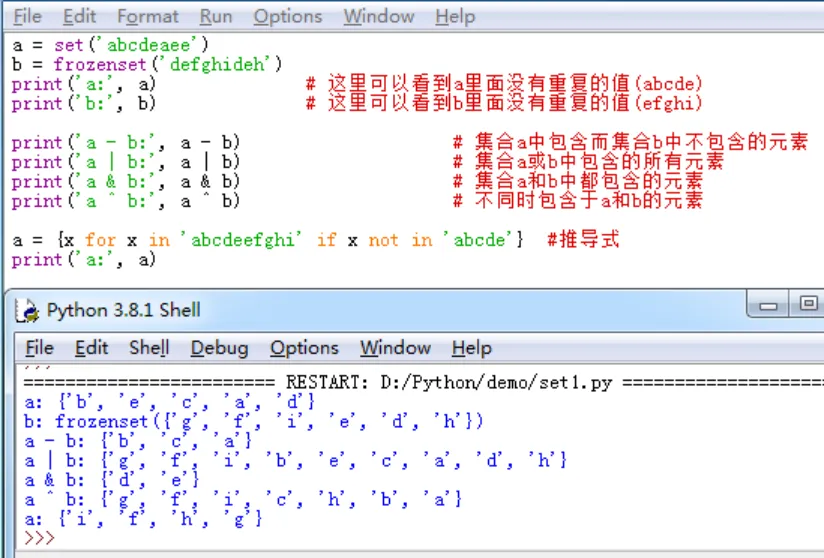 集合是一个无序的不重复元素序列。同数学中的集合一样,集合可以执行集合的并、交、差运算。集合有两种不同的类型,可变集合和不可变集合,可变集合可以添加或删除元素,因此不能用作字典的键;不可变集合不能添加或删除元素,可以做字典的键。可以使用大括号{}或者函数创建集合,注意:创建一个空集合不能用{},因为{}是用来创建一个空字典。可变集合使用set函数,不可变集合使用frozenset函数。s1 = {value01, value02,...}set(value)frozenset(value)