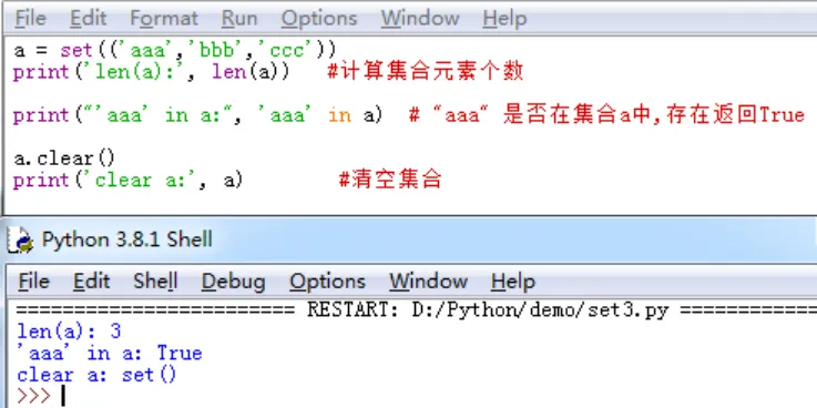 将元素x从集合s中移除,如果元素不存在,则会发生错误。将元素x从集合s中移除,且如果元素不存在,不会发生错误。随机删除集合中的一个元素。pop 方法会对集合进行无序的排列,然后将这个无序排列集合的左面第一个元素进行删除。3、计算集合元素个数