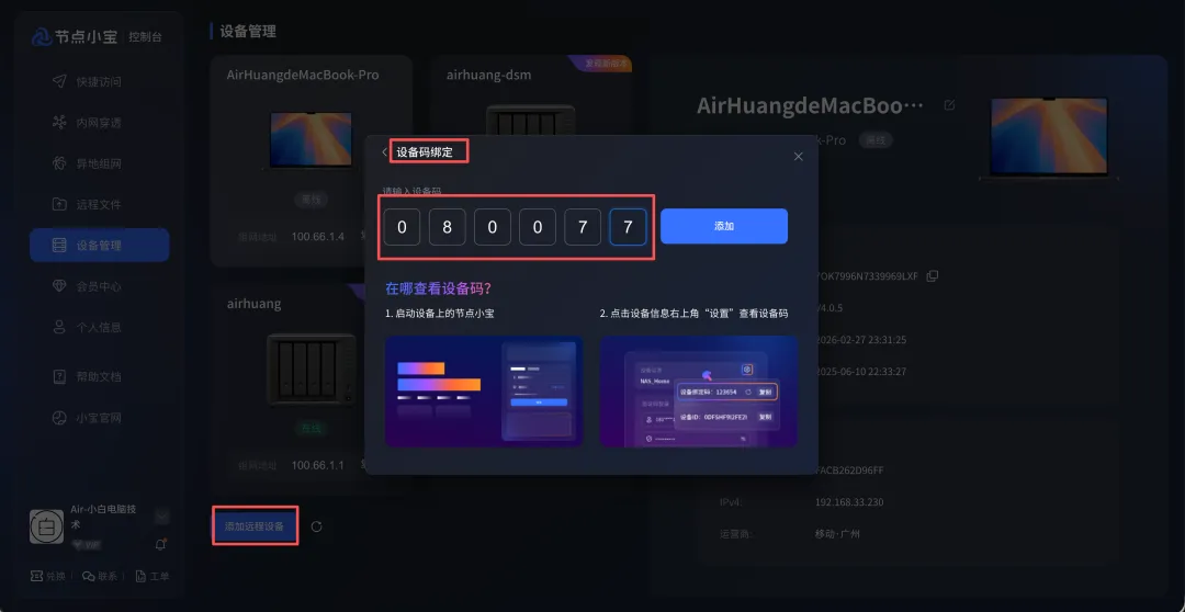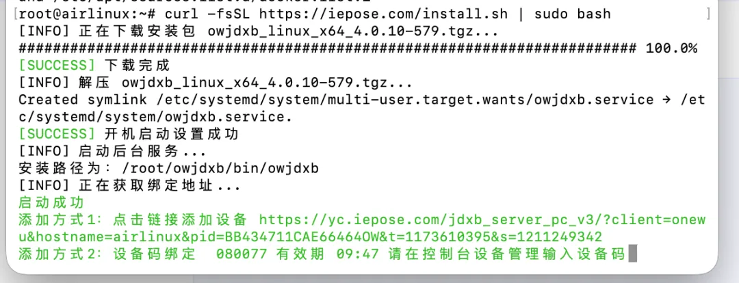 4. 安装完成后,系统将自动生成该设备的绑定地址及绑定码。