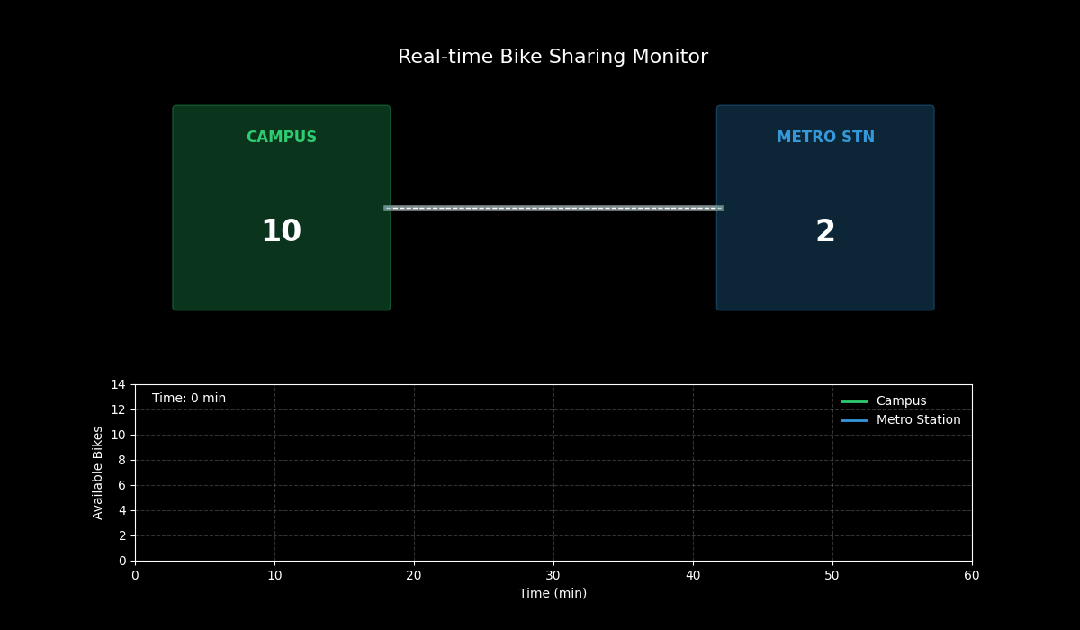 import numpy as npimport matplotlib.pyplot as pltfrom matplotlib.animation import FuncAnimationimport matplotlib.patches as patches# ==========================================# 共享单车系统仿真模型# ==========================================# 1. 系统参数TOTAL_BIKES = 12P_CAMPUS_TO_METRO = 0.5# 校园 -> 地铁站 的概率 (每分钟)P_METRO_TO_CAMPUS = 0.4# 地铁站 -> 校园 的概率 (每分钟)DURATION = 60# 模拟时长 (分钟)# 2. 初始化状态# bikes_campus: 校园里的单车数# bikes_metro: 地铁站里的单车数state = {'campus': 10, 'metro': 2,'campus_history': [],'metro_history': [],'movements': [] # 记录每一帧的移动事件: None, 'c2m', 'm2c'}# 3. 模拟函数defrun_step(current_state):# 记录历史 current_state['campus_history'].append(current_state['campus']) current_state['metro_history'].append(current_state['metro'])# 模拟移动 move = None# 检查从校园到地铁站的借车请求if np.random.random() < P_CAMPUS_TO_METRO:if current_state['campus'] > 0: current_state['campus'] -= 1 current_state['metro'] += 1 move = 'c2m'# 检查从地铁站到校园的借车请求if np.random.random() < P_METRO_TO_CAMPUS:if current_state['metro'] > 0: current_state['metro'] -= 1 current_state['campus'] += 1 move = 'm2c' current_state['movements'].append(move)# 运行完整模拟以获取数据np.random.seed(42) # 固定种子保证结果可复现sim_data = {'campus': [10],'metro': [2],'movements': [None]}temp_state = {'campus': 10, 'metro': 2, 'campus_history': [], 'metro_history': [], 'movements': []}for _ in range(DURATION): run_step(temp_state)sim_data['campus'].extend(temp_state['campus_history'])sim_data['metro'].extend(temp_state['metro_history'])sim_data['movements'].extend(temp_state['movements'])# ==========================================# 动态可视化 (Dashboard 风格)# ==========================================plt.style.use('dark_background')fig = plt.figure(figsize=(12, 7))gs = fig.add_gridspec(2, 2, height_ratios=[1.5, 1])# --- 上半部分:实时场景模拟 ---ax_map = fig.add_subplot(gs[0, :])ax_map.set_xlim(0, 100)ax_map.set_ylim(0, 40)ax_map.set_title("Real-time Bike Sharing Monitor", color='white', fontsize=16, pad=10)ax_map.axis('off')# 绘制地点# 校园 (左侧)campus_rect = patches.FancyBboxPatch((5, 5), 25, 30, boxstyle="round,pad=0.5", fc='#27ae60', ec='#2ecc71', alpha=0.3)ax_map.add_patch(campus_rect)ax_map.text(17.5, 30, "CAMPUS", ha='center', color='#2ecc71', fontsize=12, fontweight='bold')text_campus_count = ax_map.text(17.5, 15, "", ha='center', color='white', fontsize=24, fontweight='bold')# 地铁站 (右侧)metro_rect = patches.FancyBboxPatch((70, 5), 25, 30, boxstyle="round,pad=0.5", fc='#2980b9', ec='#3498db', alpha=0.3)ax_map.add_patch(metro_rect)ax_map.text(82.5, 30, "METRO STN", ha='center', color='#3498db', fontsize=12, fontweight='bold')text_metro_count = ax_map.text(82.5, 15, "", ha='center', color='white', fontsize=24, fontweight='bold')# 道路ax_map.plot([30, 70], [20, 20], '-', color='#7f8c8d', lw=4, zorder=0)ax_map.plot([30, 70], [20, 20], '--', color='white', lw=1, zorder=0)# 骑行者图标 (初始隐藏)rider = ax_map.text(50, 22, "🚴", ha='center', fontsize=30, color='#f1c40f', alpha=0)# --- 下半部分:数据图表 ---# 校园单车数量曲线ax_chart = fig.add_subplot(gs[1, :])ax_chart.set_xlim(0, DURATION)ax_chart.set_ylim(0, TOTAL_BIKES + 2)ax_chart.set_xlabel("Time (min)")ax_chart.set_ylabel("Available Bikes")ax_chart.grid(True, linestyle='--', alpha=0.2)line_campus, = ax_chart.plot([], [], '-', color='#2ecc71', lw=2, label='Campus')line_metro, = ax_chart.plot([], [], '-', color='#3498db', lw=2, label='Metro Station')ax_chart.legend(loc='upper right', frameon=False)# 时间指示器time_text = ax_chart.text(0.02, 0.9, "", transform=ax_chart.transAxes, color='white')defupdate(frame):# 1. 更新计数文本 c_count = sim_data['campus'][frame] m_count = sim_data['metro'][frame] text_campus_count.set_text(f"{c_count}") text_metro_count.set_text(f"{m_count}")# 2. 更新骑行动画# 获取当前分钟发生的移动事件 move = sim_data['movements'][frame]if move == 'c2m': # 校园 -> 地铁 rider.set_text("🚴 ➤") rider.set_x(40) # 简化的位置示意 rider.set_alpha(1) rider.set_color('#2ecc71') # 绿色代表来自校园elif move == 'm2c': # 地铁 -> 校园 rider.set_text("◀ 🚴") rider.set_x(60) rider.set_alpha(1) rider.set_color('#3498db') # 蓝色代表来自地铁else: rider.set_alpha(0) # 没人骑车# 3. 更新曲线图 line_campus.set_data(range(frame+1), sim_data['campus'][:frame+1]) line_metro.set_data(range(frame+1), sim_data['metro'][:frame+1]) time_text.set_text(f"Time: {frame} min")return text_campus_count, text_metro_count, rider, line_campus, line_metro, time_text# 生成动画ani = FuncAnimation(fig, update, frames=DURATION+1, interval=100, blit=True)ani.save('../images/02_bike_share_dynamic.gif', writer='pillow', fps=10)print("Animation saved to ../images/02_bike_share_dynamic.gif")动态演示效果:
