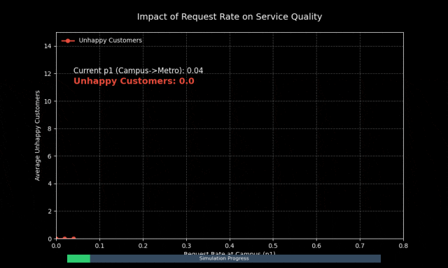 import numpy as npimport matplotlib.pyplot as pltfrom matplotlib.animation import FuncAnimation# ==========================================# 参数扫视模拟# ==========================================TOTAL_BIKES = 12DURATION = 60NUM_SIMULATIONS = 20# 每个参数值重复模拟的次数 (用于平滑曲线)P2 = 0.4# 地铁站 -> 校园 的固定概率# 借车概率 (校园 -> 地铁) 范围:0 到 0.8p1_array = np.linspace(0, 0.8, 41)# 存储结果:每个 p1 对应的不满意客户数 (平均值)sweep_results = []current_p1_index = 0defrun_simulation(p1, p2, num_steps): state = {'campus': 10, 'metro': 2, 'unhappy': 0}for _ in range(num_steps):# 校园 -> 地铁if np.random.random() < p1:if state['campus'] > 0: state['campus'] -= 1 state['metro'] += 1else: state['unhappy'] += 1# 地铁 -> 校园if np.random.random() < p2:if state['metro'] > 0: state['metro'] -= 1 state['campus'] += 1# 这里简化,不统计地铁站的不满意客户return state['unhappy']# ==========================================# 动态可视化# ==========================================plt.style.use('dark_background')fig, ax = plt.subplots(figsize=(10, 6))ax.set_xlim(0, 0.8)ax.set_ylim(0, 15)ax.set_xlabel("Request Rate at Campus (p1)")ax.set_ylabel("Average Unhappy Customers")ax.set_title("Impact of Request Rate on Service Quality", fontsize=14, color='white', pad=20)ax.grid(True, linestyle='--', alpha=0.3)# 绘制曲线line, = ax.plot([], [], 'o-', color='#e74c3c', lw=2, markersize=6, label='Unhappy Customers')ax.legend(loc='upper left', frameon=False)# 动态文本text_param = ax.text(0.05, 0.8, "", transform=ax.transAxes, color='white', fontsize=12)text_result = ax.text(0.05, 0.75, "", transform=ax.transAxes, color='#e74c3c', fontsize=14, fontweight='bold')# 进度条背景ax_progress = fig.add_axes([0.15, 0.02, 0.7, 0.03]) # [left, bottom, width, height]ax_progress.set_xlim(0, 1)ax_progress.set_ylim(0, 1)ax_progress.axis('off')rect_bg = plt.Rectangle((0, 0), 1, 1, fc='#34495e', ec=None)ax_progress.add_patch(rect_bg)rect_progress = plt.Rectangle((0, 0), 0, 1, fc='#2ecc71', ec=None)ax_progress.add_patch(rect_progress)ax_progress.text(0.5, 0.5, "Simulation Progress", ha='center', va='center', color='white', fontsize=8)defupdate(frame):global current_p1_indexif current_p1_index < len(p1_array): p1 = p1_array[current_p1_index]# 运行多次模拟取平均值 total_unhappy = 0for _ in range(NUM_SIMULATIONS): total_unhappy += run_simulation(p1, P2, DURATION) avg_unhappy = total_unhappy / NUM_SIMULATIONS sweep_results.append(avg_unhappy)# 更新曲线 line.set_data(p1_array[:len(sweep_results)], sweep_results)# 更新文本 text_param.set_text(f"Current p1 (Campus->Metro): {p1:.2f}") text_result.set_text(f"Unhappy Customers: {avg_unhappy:.1f}")# 更新进度条 progress = (current_p1_index + 1) / len(p1_array) rect_progress.set_width(progress) current_p1_index += 1return line, text_param, text_result, rect_progress# 生成动画ani = FuncAnimation(fig, update, frames=len(p1_array)+10, interval=100, blit=True)ani.save('../images/02_bike_share_sweep.gif', writer='pillow', fps=10)print("Animation saved to ../images/02_bike_share_sweep.gif")动态参数扫视效果: