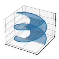 # 1. 导入库与样式设置import matplotlib.pyplot as pltimport numpy as npplt.style.use('_mpl-gallery')# 2. 生成双螺旋数据n = 50theta = np.linspace(0, 2*np.pi, n) # 角度从 0 到 2π,共 50 个点x1 = np.cos(theta) # 第一条螺旋的 x 坐标(圆轨迹)y1 = np.sin(theta) # 第一条螺旋的 y 坐标z1 = np.linspace(0, 1, n) # 第一条螺旋的 z 坐标(从 0 到 1 线性增加)x2 = np.cos(theta + np.pi) # 第二条螺旋的 x 坐标(相位偏移 π,即相对侧)y2 = np.sin(theta + np.pi) # 第二条螺旋的 y 坐标z2 = z1 # 第二条螺旋的 z 坐标与第一条相同# 通过 theta 生成一个圆周上的点,(x1, y1) 构成一个单位圆。# 随着 z1 线性增加,(x1, y1, z1) 形成一条上升的螺旋线。# 第二条螺旋线的 (x2, y2) 相位偏移 π,因此它位于圆的另一侧,与第一条螺旋线共同构成双螺旋结构(类似 DNA 的两条链)。#3. 创建三维图形并绘制fig, ax = plt.subplots(subplot_kw={"projection": "3d"})ax.fill_between(x1, y1, z1, x2, y2, z2, alpha=0.5)ax.plot(x1, y1, z1, linewidth=2, color="C0")ax.plot(x2, y2, z2, linewidth=2, color="C0")# subplot_kw={"projection": "3d"} 创建一个三维坐标轴。# ax.fill_between(...):这里意图填充两条螺旋线之间的区域# ax.plot(...) 绘制两条螺旋线,线宽为 2,颜色均为 C0(默认蓝色)。# 4. 设置坐标轴标签ax.set(xticklabels=[], yticklabels=[], zticklabels=[])# 隐藏三个坐标轴的刻度标签,使图形更简洁。# 5. 显示图形plt.show()