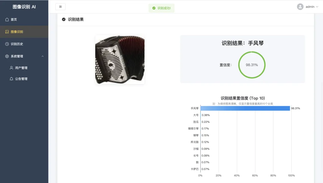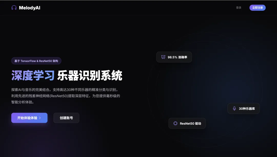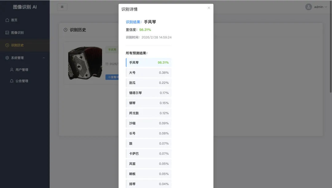 本项目是一个基于深度学习的乐器识别系统,旨在通过计算机视觉技术实现对多种乐器的高效、精准识别。系统支持识别30种常见乐器(如钢琴、小提琴、风笛、阿尔卑斯号角等),涵盖了键盘、弦乐、管乐及打击乐等多种分类。在技术实现上,项目采用了前后端分离的现代化架构。前端基于Vue3和Element Plus构建,提供响应式、交互友好的用户界面,用户可以便捷地上传乐器图片并实时查看识别结果。后端采用轻量级的Python Web框架Flask,负责处理前端请求、业务逻辑以及模型推理的调度。核心算法层面,系统利用TensorFlow框架并引入经典的ResNet50残差神经网络作为特征提取基石,通过在大规模乐器数据集上的迁移学习与微调,确保了模型对不同乐器外观、材质和复杂背景的鲁棒性,从而达到了理想的识别准确率。