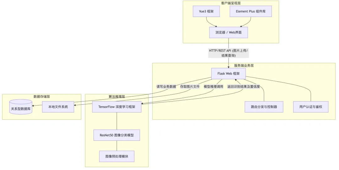 技术栈:前端 Vue3 + Element Plus,后端 Flask,算法 TensorFlow + ResNet50