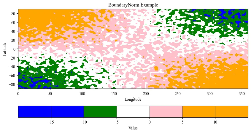 import numpy as np import matplotlib.pyplot as plt from matplotlib.colors import ListedColormap, BoundaryNorm# ===============================# 1. 自定义颜色与区间# =============================== colors = ['blue', 'green', 'white', 'pink', 'orange'] bounds = [-15, -10, -5, 0, 5, 10] # 区间边界,长度 = len(colors)+1 cmap = ListedColormap(colors) norm = BoundaryNorm(bounds, cmap.N)# ===============================# 2. 模拟数据# =============================== lon = np.linspace(0, 360, 100) lat = np.linspace(-90, 90, 60) lon2, lat2 = np.meshgrid(lon, lat)# 示例数据 base_data = 10 * np.sin(np.deg2rad(lat2)) * np.cos(np.deg2rad(lon2 / 2))# 添加小幅随机扰动,让数据不完全规则 noise = np.random.uniform(-5, 5, size=base_data.shape) data = base_data + noise # 最终数据# ===============================# 3. 绘制 contourf# =============================== fig, ax = plt.subplots(figsize=(10,5)) cf = ax.contourf( lon2, lat2, data, levels=bounds, # 使用 bounds 来定义区间 cmap=cmap, norm=norm, extend='both'# 两端超出范围显示 extend ) ax.set_xlabel("Longitude") ax.set_ylabel("Latitude") ax.set_title("BoundaryNorm Example")# ===============================# 4. 添加 colorbar(带 drawedges, extendrect, extendfrac)# =============================== cbar = fig.colorbar( cf, orientation='horizontal', extend='both', drawedges=True, extendrect=True, extendfrac='auto', boundaries=bounds, ticks=bounds ) cbar.set_label("Value") cbar.ax.tick_params(labelsize=10) plt.show()