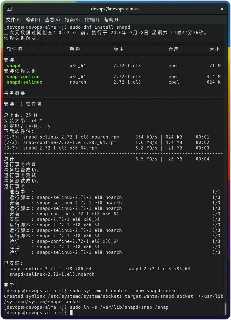 现在,执行以下命令以安装 Snapd,并在 Rocky 或其他类似的基于 RHEL 的 Linux 系统上启用并启动其守护进程:sudo dnf install snapdsudo systemctl enable --now snapd.socketsudo ln -s /var/lib/snapd/snap /snap