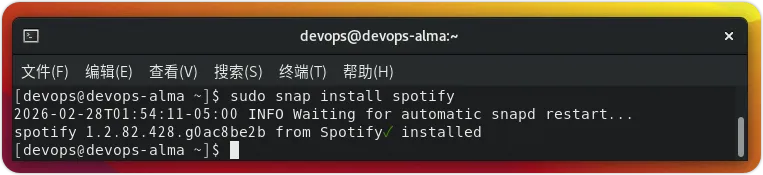 安装完 Snap 后,我们只需使用一条命令即可在 Linux 上安装 Spotify:sudo snap install spotify