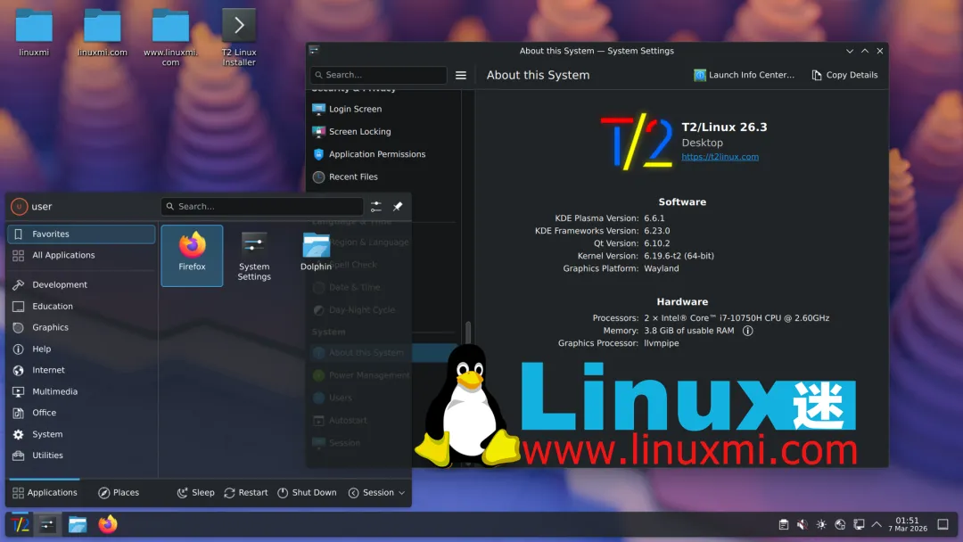 T2 Linux 26.3 的一个重要目标,是在不同硬件架构上提供 一致且可复现的桌面体验。为此,新版本整合了基于 Wayland 的 KDE Plasma 桌面环境,并确保它能够在多种架构上通过交叉编译方式顺利构建和运行。