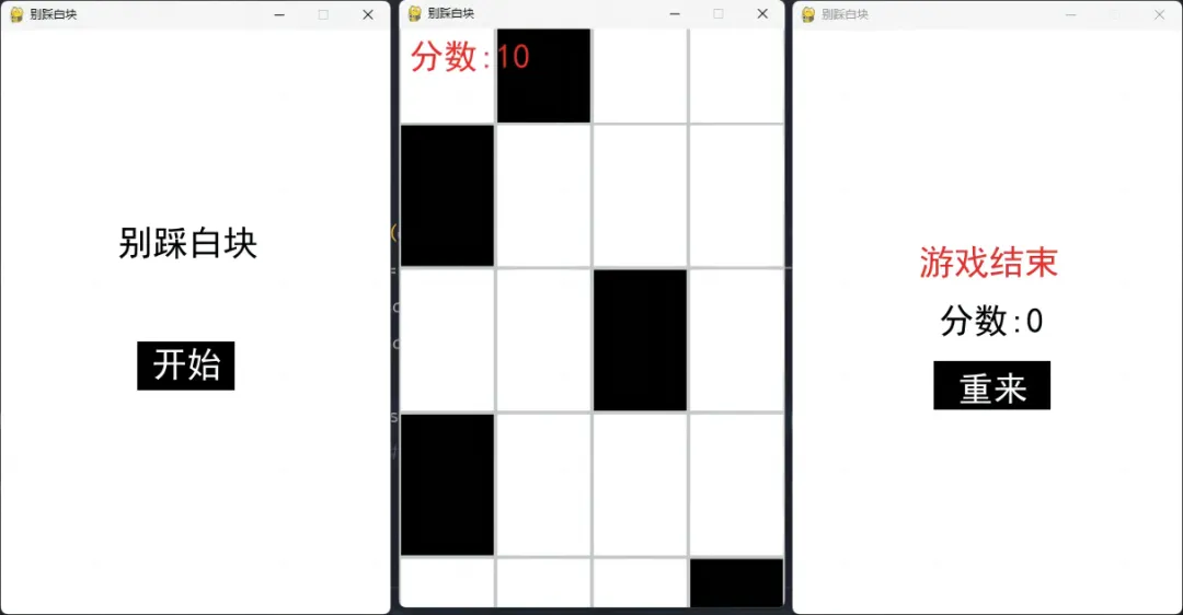 这篇文章主要想分享一下,我用 Python + pygame 实现《别踩白块》小游戏的过程。整体代码不算多,但从界面、交互到游戏状态切换,做下来还是挺有意思的。