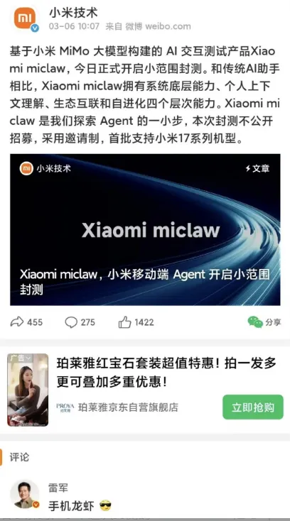 面对这样一个极具颠覆性的超级入口,国内的科技巨头们彻底坐不住了,甚至出现了一丝罕见的“恐慌式布局”。就在今天,腾讯在深圳总部大厦门口干了一件极具仪式感的事:由腾讯云工程师现场手把手协助,帮近千名开发者和 AI 爱好者完成 OpenClaw 的云端一键部署。 排队的人群里,有 70 岁的非遗专家,也有带着 2 岁孩子的家长。腾讯员工感慨:“上一次这么大阵仗,还是新年发红包。”腾讯为什么要花这么大力气教普通人“养虾”? 因为它不仅是在办活动,它是在抢夺下一代人机交互的入口控制权。腾讯轻量云借此迅速斩获了超 10 万的“云上养虾人”。同一时间,雷军也亲自下场,在微博上留下了四个字:“手机龙虾。” 小米开启了基于其自研大模型的 Xiaomi miclaw 封测。小米的野心更大,他们想让手机直接变成 AI 的“执行终端”。 通过打通米家 IoT 协议,这只龙虾甚至能爬进你的家里。只要你一句话,它就能自动调用家里的所有智能设备帮你干活。字节的火山引擎、阿里的阿里云也紧随其后,纷纷推出一键部署指南。 巨头们心知肚明:谁能把这只“龙虾”圈养在自己的服务器和系统里,谁就拿到了 2026 年通向未来的第一张船票。03 ⚠️ 危险的“双手”:执行力背后的深渊