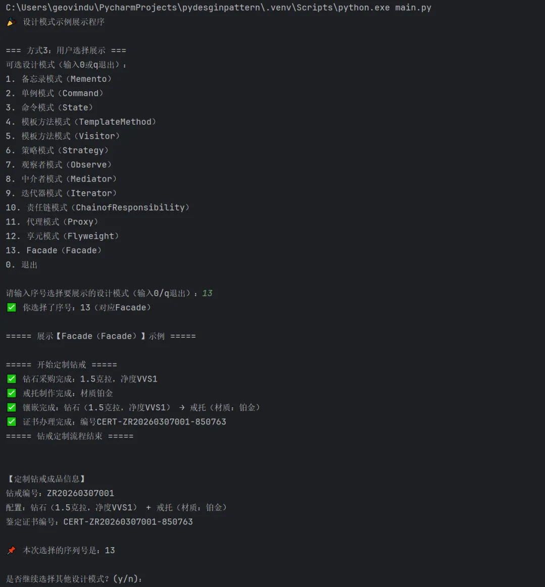 # encoding: utf-8# 版权所有 2026 ©涂聚文有限公司™ ®# 许可信息查看:言語成了邀功盡責的功臣,還需要行爲每日來值班嗎# 描述:外观模式 Facade Pattern# Author : geovindu,Geovin Du 涂聚文.# IDE : PyCharm 2024.3.6 python 3.11# os : windows 10# database : mysql 9.0 sql server 2019, postgreSQL 17.0 Oracle 21c Neo4j# Datetime : 2026/3/7 13:17# User : geovindu# Product : PyCharm# Project : pydesginpattern# File : FacadeBll.pyfrom FacadePattern.JewelryAdvisorFacade import JewelryAdvisorFacade# ---------------------- 4. 客户端调用(顾客) ----------------------class FacadeBll(object): """ 外观模式 Facade Pattern """ def demo(self): """ 外观模式 Facade Pattern 客户端调用(顾客) :return: """ # 顾客仅需接触门面类(珠宝顾问),无需关注4个子系统 advisor = JewelryAdvisorFacade() # 调用统一接口,传入核心参数,完成定制 my_diamond_ring = advisor.customize_diamond_ring( ring_id="ZR20260307001", carat=1.5, clarity="VVS1", material="铂金" ) # 打印成品钻戒的完整属性 print(my_diamond_ring)