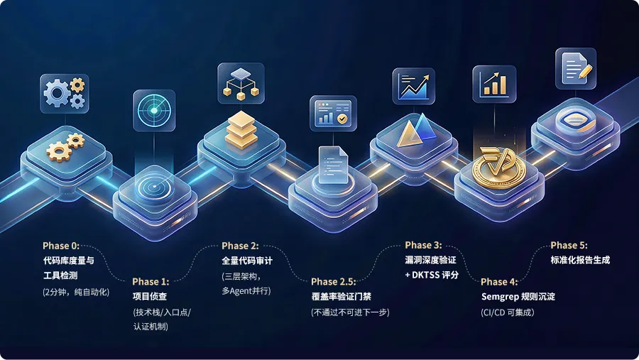 Phase 1-3(核心审计流程):项目侦察 → 全量代码审计 → 覆盖率门禁 → 漏洞深度验证,这是整个 Skill 体系的核心能力点,下文将重点拆解。