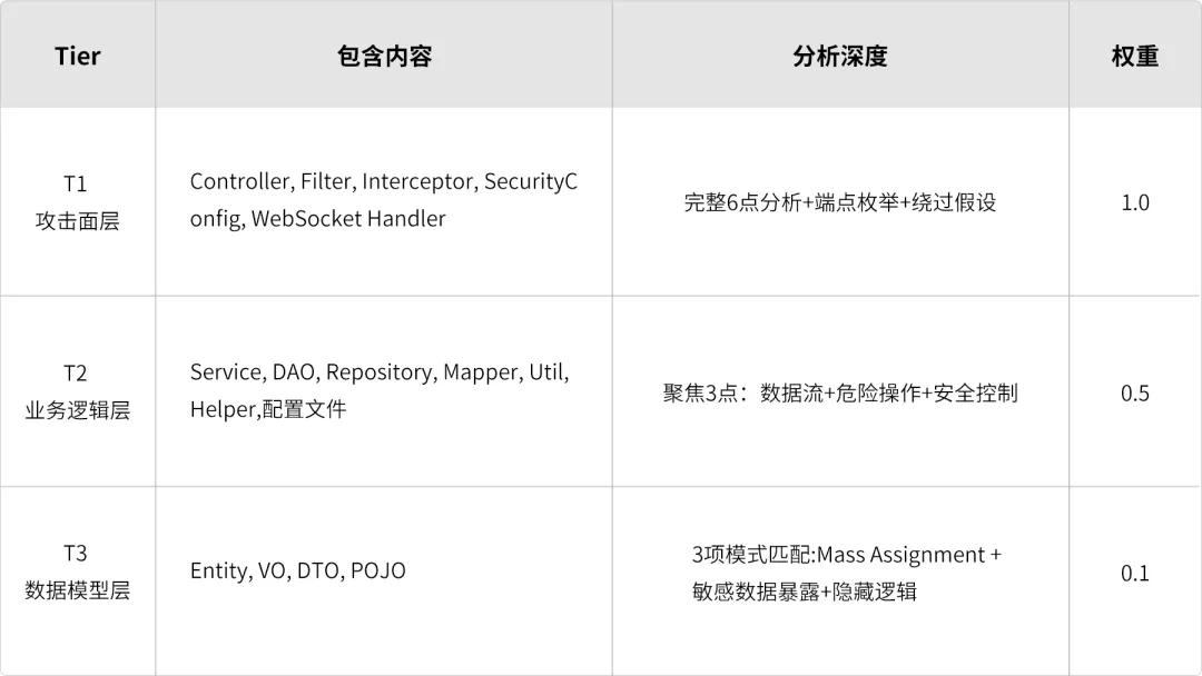Rule 0: 第三方库源码 → SKIP(不审计 Fastjson 源码,审计你怎么调用它)Rule 1: Layer 1 预扫描有 P0/P1 候选项 → T1(动态提升)Rule 2: 含 @Controller/@RestController/@WebServlet/Filter → T1Rule 3: 含 @Service/@Repository/@Mapper → T2Rule 4: 类名含 Util/Helper/Handler → T2Rule 5: .properties/.yml/security.xml → T2Rule 6: 含 @Entity/@Table/@Data → T3Rule 7: 未匹配任何规则 → T2(保守兜底,不降级)Rule 8: T3 文件有 P2/P3 候选项 → 保持 T3 但标记 review_flag