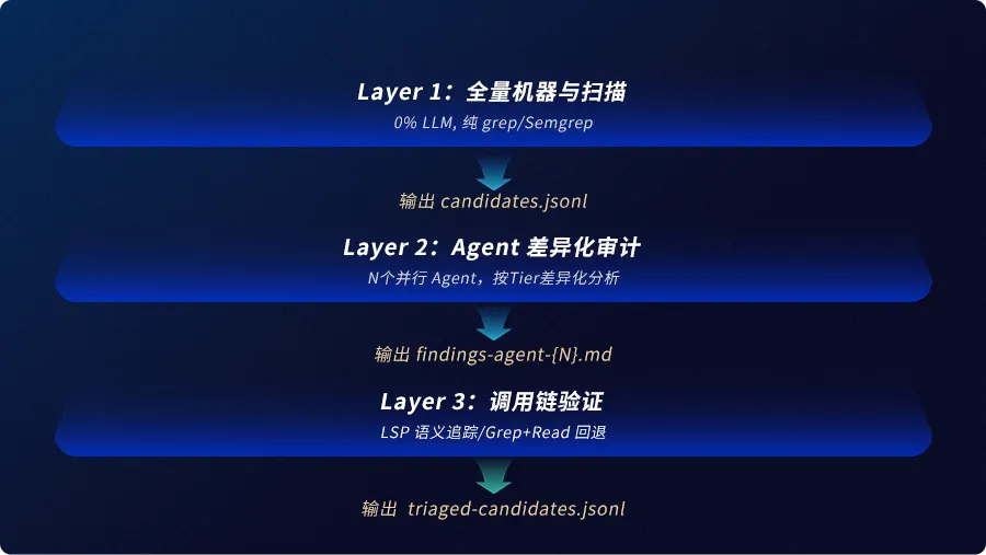 注意:Layer 1 的输出是 Layer 2 Agent 的"辅助参考",不是"唯一入口"。Agent 不能只看 Layer 1 标记的文件——它必须逐文件阅读所有分配给它的代码。Layer 1 的价值只是告诉 Agent"这个文件里有已知危险模式,优先验证",但 Agent 自己的代码阅读才是发现漏洞的主通道,这主要是为了避免只看工具标记的文件,而遗漏工具无法识别的逻辑漏洞。
