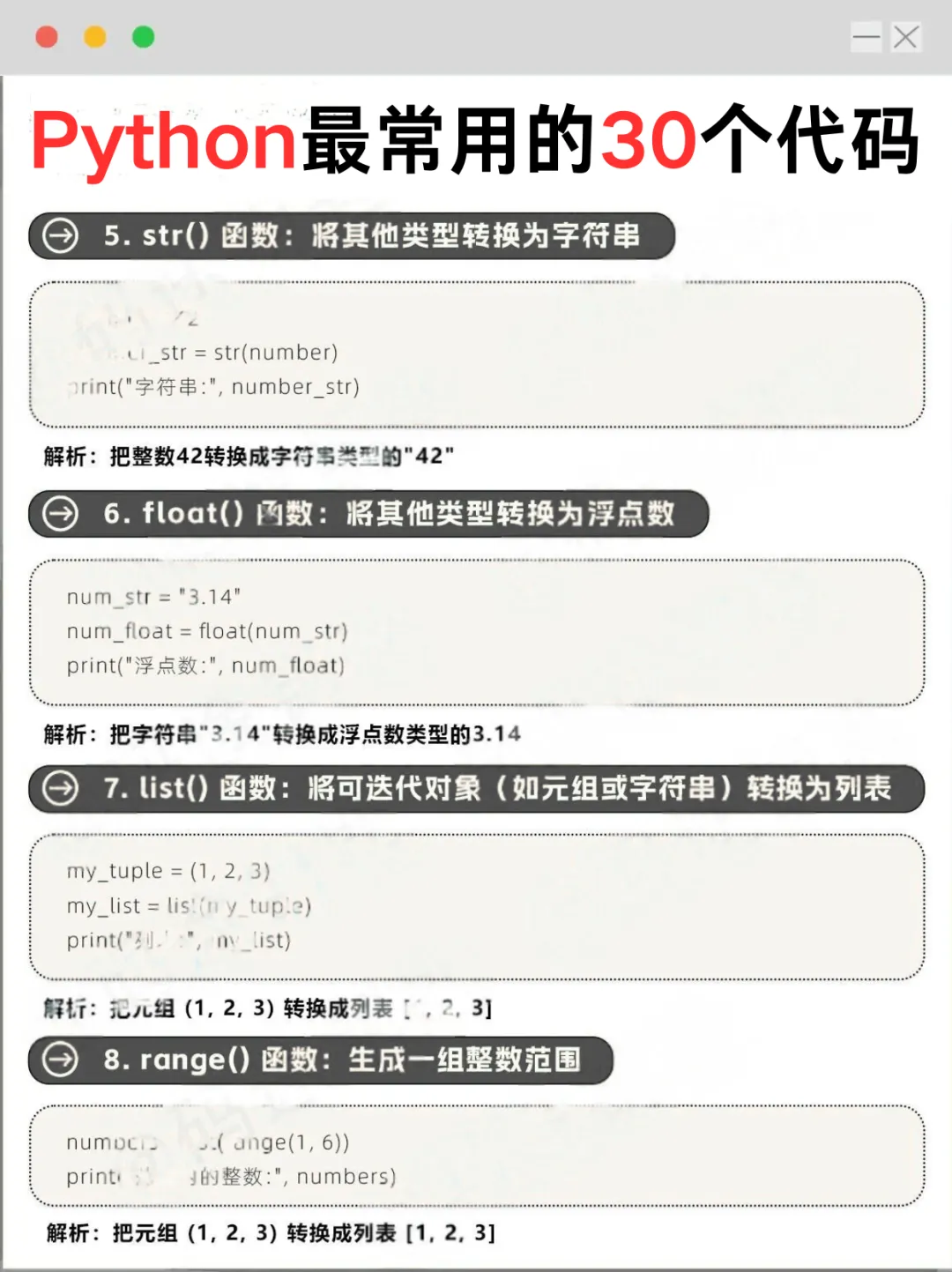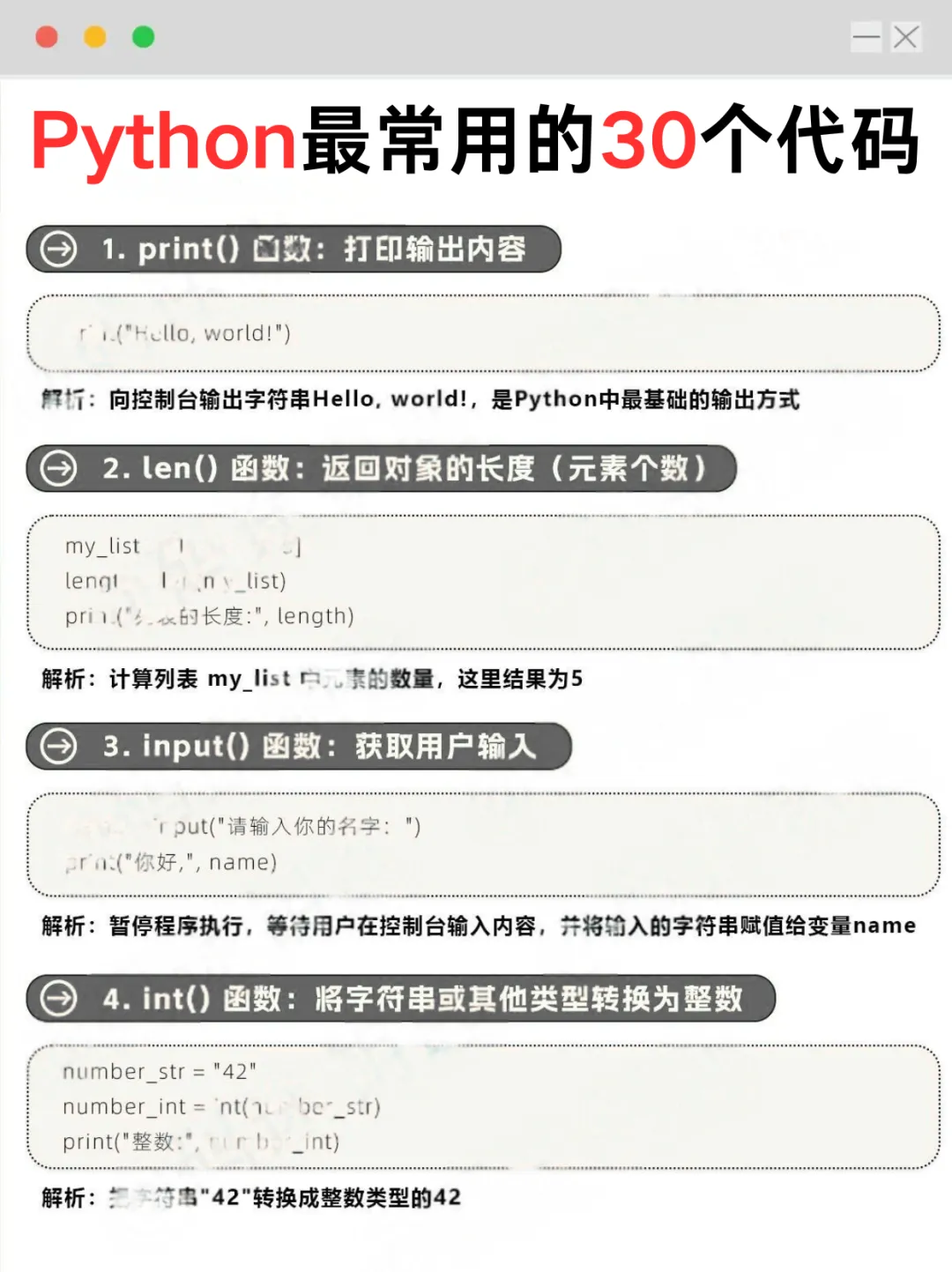 每个函数都写了核心作用,代码直接复制就能跑,边练边记效果翻倍!想入门Python的小伙伴赶紧收藏,多看几遍就能摆脱“学了就忘”的魔咒 ✨