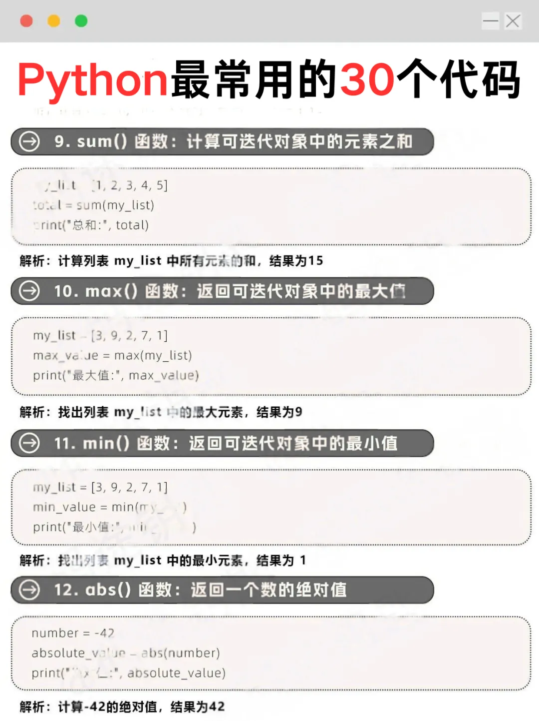 熬夜整理了Python最核心的30个函数,每个都配上实战案例+详细注释,从最基础的print、len到进阶的map、filter,覆盖日常写代码90%的场景,新手照着抄就完事了!