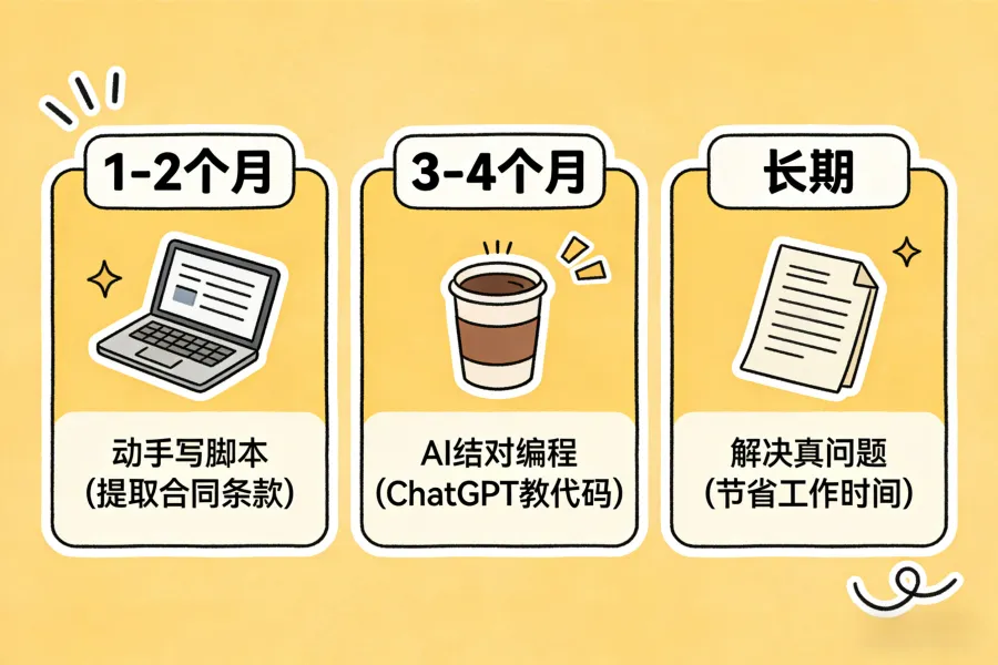 不要从《Python基础教程》第一章开始啃。直接找个"用Python批量处理Word文档"的教程,跟着做。当你亲手写出一个能自动提取合同中"违约责任"条款的脚本时,那种成就感会推着你继续学。