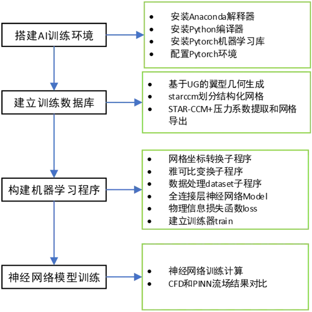当 AI For Science 的浪潮席卷工业研发领域,AI For CAE正成为高端制造智能化升级的核心赛道,从航空航天的飞行器设计到新能源的流体机械研发,人工智能与仿真技术的深度融合,正在打破传统数值计算的技术瓶颈,重构工业仿真的效率与精度边界。作为 CAE 领域的核心分支,计算流体动力学(CFD)是翼型流场设计的关键技术,却长期受困于网格依赖、计算低效、复杂场景难收敛的行业痛点,成为制约气动研发效率的关键因素。而物理信息神经网络(PINN)的出现,凭借物理定律嵌入、摆脱数据依赖的核心优势,为 CFD 技术的创新突破提供了全新思路,尤其是将工业级 CFD 仿真软件 STAR-CCM + 与 Python 开发的 PINN 模型深度融合,更是构建了 “传统仿真取数 —AI 模型预测” 的翼型流场计算新范式。本文将从 PINN 的技术内核出发,全流程拆解 STAR-CCM + 与 Python-PINN 的融合实操方法,通过实战对比验证其工程价值,为 CFD 工程师与科研人员打造从理论到实操的完整参考体系。在航空航天、新能源等高端制造领域,翼型流场计算是飞行器设计、流体机械研发的核心环节,计算流体动力学(CFD)则是实现这一环节的关键技术。然而,传统CFD技术在翼型流场计算中长期面临“网格依赖、计算低效、复杂场景难收敛”的行业痛点,工程师往往需要耗费数天甚至数周进行网格划分与参数调试,却仍难以在精度与效率之间找到平衡。随着AI for Science的飞速发展,物理信息神经网络(PINN)凭借“嵌入物理定律、摆脱数据依赖”的核心优势,成为打破CFD发展瓶颈的关键技术。而将工业级CFD仿真软件STAR-CCM+与Python开发的PINN模型深度融合,更是构建了“传统仿真获取高保真数据—AI模型实现高效预测”的翼型流场计算新范式。本文将从PINN的技术优势出发,全流程拆解STAR-CCM+与Python-PINN的融合实操方法,通过实战对比验证其工程价值,为CFD工程师与科研人员提供从理论到实操的完整参考。传统CFD技术之所以在翼型流场计算中陷入发展困局,其核心在于技术原理的先天限制。目前主流的CFD方法均依赖有限体积法、有限元法求解流体力学的偏微分方程(PDEs),而这类方法的计算精度完全由网格质量决定——想要提升流场预测精度,就必须划分更密集的网格,而网格密度的提升不仅会大幅增加前期划分的工作量,更会让后续的仿真求解陷入“计算量指数级增长”的困境。对于高雷诺数、复杂翼型这类工程常见的复杂工况,传统CFD还极易出现收敛困难的问题,即便投入大量计算资源,也难以得到可靠的流场数据。此外,传统CFD的迭代优化成本极高,翼型设计的微小调整,都意味着需要重新划分网格、重复仿真计算,让研发周期大幅拉长。物理信息神经网络(PINN)的出现,从根本上改变了流场计算的底层逻辑,使其成为CFD技术的天然“破局者”。PINN的核心创新,是将流体力学的核心物理定律(如翼型流场计算中的欧拉方程)作为正则化项,直接嵌入神经网络的训练过程,通过损失函数的约束,强制模型的输出结果严格服从物理规律。这种“物理驱动”的建模模式,让PINN摆脱了传统机器学习“数据驱动”的局限,无需海量标注数据就能实现高精度的流场预测。PINN实现了计算效率的质的提升,训练完成的PINN模型在翼型流场预测中,速度比传统CFD快一个数量级,即便面对多次迭代的翼型优化设计,也能通过快速预测大幅缩短研发周期。PINN能完美适配复杂流场场景,对于传统CFD难以收敛的高雷诺数、复杂翼型流场,PINN通过物理定律的硬约束实现稳定预测,甚至能捕捉到传统仿真难以发现的流体奇点等细节特征。与其他人工智能模型不同,PINN并非难以理解的“黑箱模型”,其底层逻辑具有高度的可解释性。工程师能够清晰拆解欧拉方程等物理定律如何与神经网络的结构、损失函数相结合,理解每一步训练的物理意义,而这种可解释性正是PINN能够落地工程实践的核心前提,让AI+CFD的融合不再是纸上谈兵,而是能真正应用于翼型流场计算的实际工程场景。STAR-CCM+与Python-PINN融合的全流程实操STAR-CCM+作为工业级的CFD仿真软件,具备高精度、高可靠性的流场仿真能力,是获取翼型流场高保真数据的核心工具;而Python凭借丰富的深度学习库、灵活的代码开发能力,成为PINN模型构建与训练的最佳选择。将二者深度融合,构建“STAR-CCM+仿真取数—Python-PINN建模预测—双向验证优化”的全流程,是实现翼型流场高效计算的关键。整个实操流程以“工程落地”为核心,分为基础环境搭建、STAR-CCM+仿真实战、Python开发PINN模型三大模块。工欲善其事,必先利其器,STAR-CCM+与Python-PINN融合的前提,是完成工具环境的搭建与协同测试,避免因环境配置问题影响后续实操。首先是Python环境的搭建,优先选择Anaconda作为Python解释器,其自带的环境管理功能能有效避免不同库之间的版本冲突,同时搭配Pycharm编译器,提升代码开发与调试的效率。在安装过程中,需重点完成环境变量的配置,确保系统能够正常识别Python与相关工具的路径,这是后续深度学习库安装与运行的基础。其次是深度学习库的配置,核心安装PyTorch机器学习库——作为PINN模型开发的核心框架,PyTorch兼具灵活性与高效性,适配流场计算的高维特征处理需求。在安装完成后,需对PyTorch环境进行调试,通过简单的张量运算与模型训练测试,确保环境能够适配翼型流场计算的PINN模型开发。最后是工具协同测试,这是环境搭建的
