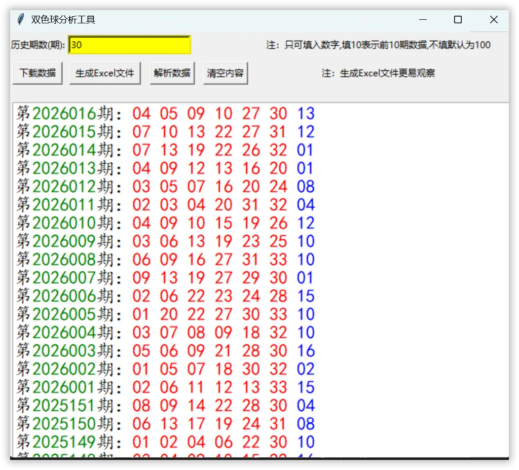 本次Python实战项目是一款双色球历史数据爬取与分析工具,最终能实现从福彩官网爬取指定期数(默认100期)的真实开奖数据,完成数据查看、Excel保存、数据统计分析三大核心功能,还配有可视化图形界面。