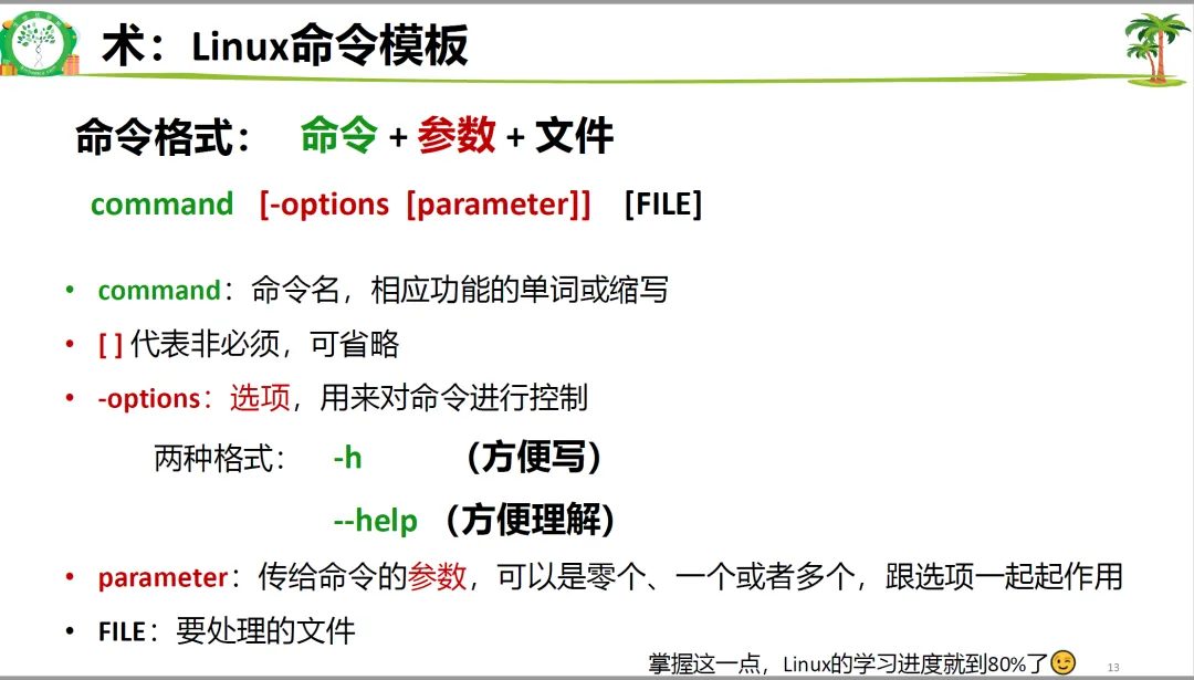 命令模板:命令 + [选项] + [参数/文件]。 例如:ls -l /home。命令和参数之间必须有空格。