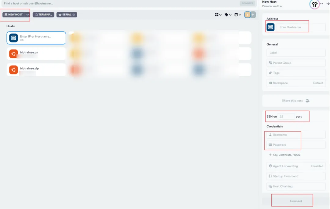 3.登录服务器:打开termius,新建host 依次填写IP地址,ssh的端口号,以及用户名和密码,然后点击connect