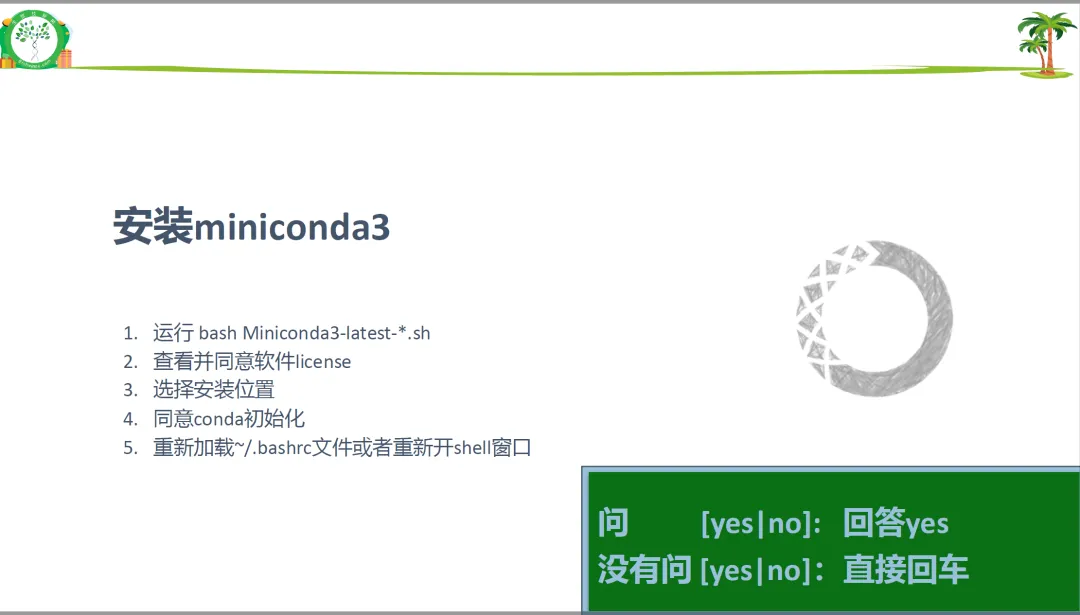 安装:运行 bash Miniconda3-xxx.sh,一路输入 yes 或按回车即可。
