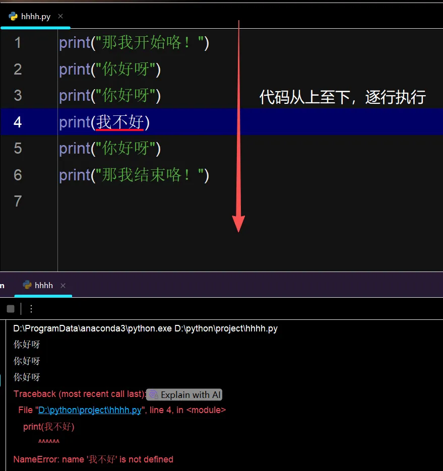 代码自上而下,逐行执行。如果执行到某行代码出现错误,程序就会报错,后面的代码将不会执行(程序死亡)。