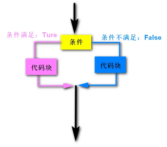 说明:条件满足就执行粉色代码块,然后再继续往下执行后面的代码;条件不满足就执行蓝色代码块,然后再继续往下执行后面的代码。(2个必须选一个执行,你才能往下走)