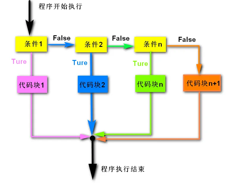if 条件1:语句块1elif 条件2:语句块2...elif 条件n:语句块nelse:所有条件都不满足时的才执行的语句块