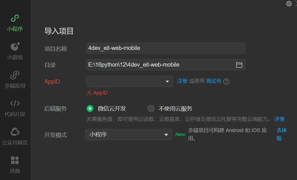 注:装下依赖,之后才能运行到浏览器或微信开发者工具。直接用微信开发者工具,需要一个appid,如下: