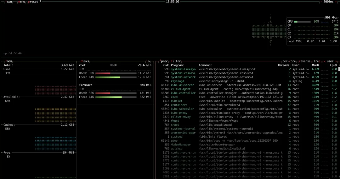 top - 13:46:24 up 2 days, 22:31, 2 users, load average: 0.63, 0.80, 0.89Tasks: 190 total, 1 running, 189 sleeping, 0 stopped, 0 zombie%Cpu(s): 11.1 us, 12.4 sy, 0.0 ni, 75.8 id, 0.2 wa, 0.0 hi, 0.5 si, 0.0 stMiB Mem : 3783.7 total, 295.6 free, 1306.2 used, 2369.9 buff/cacheMiB Swap: 0.0 total, 0.0 free, 0.0 used. 2477.5 avail MemPID USER PR NI VIRT RES SHR S %CPU %MEM TIME+ COMMAND48333 root 20 0 1660716 419656 75148 S 26.2 10.8 8,55 kube-apiserver48380 root 20 0 1435184 189292 88556 S 22.0 4.9 7,15 cilium-agent1113 root 20 0 2340800 103468 59464 S 16.7 2.7 8,48 kubelet2269 root 20 0 11.2g 105924 53132 S 13.1 2.7 6,28 etcd46206 root 20 0 1377984 133840 63416 S 7.2 3.5 161:06.43 kube-controller46249 root 20 0 1291668 70900 46200 S 3.9 1.8 81:45.80 kube-scheduler851 root 20 0 3651988 72992 38744 S 2.0 1.9 139:35.53 containerd77375 bgzxz 20 0 7868 5280 3232 R 1.3 0.1 0:00.23 top