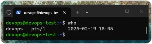 who 命令可以显示目前登录系统的用户,如下所示:上述命令的执行结果可以显示登录用户 devops,如下图所示:useradd 命令:新增用户与新增至群组