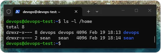 上述命令的「:」号前是用户 sean;之后是群组 root,当执行 ls -l 命令,可以看到拥有者从 devops devops 改成 sean root,如下图所示: