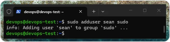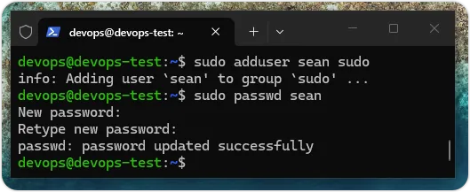 对于 Linux 操作系统的用户,例如:预设的 devops,或之前新增的 sean,我们都可以使用 passwd 命令来更改用户密码,例如:更改用户 sean 的密码,如下所示:上述命令也需要使用 sudo 执行,我们需要输入 2 次新密码来更新用户密码,如下图所示:文件权限管理命令