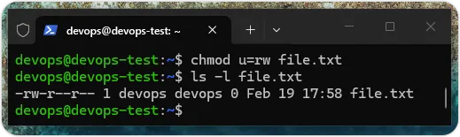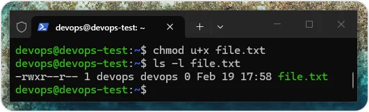 chmod 命令可以更改指定文件的权限,我们是使用字符来指定文件权限,即文件拥有者拥有文件的哪些权限。拥有者的字符 u 是用户(User);g 是群组(Group);o 是其他用户(Other Users),文件权限字符 r 是读取(Read);w 是写入(Write);x 是执行(Execute)。例如:为文件 file.txt 的拥有者新增执行权限,如下所示:上述命令的「+」号表示新增,可以为文件新增执行权限,如下图所示:上述图例在执行 chmod 命令后,再执行 ls -l 命令,可以看到前方的权限新增了 x。除了新增,我们也可以使用「=」符号指定文件的权限,如下所示:上述命令的「=」号指定文件有读写权限,当执行 ls -l 命令,可以看到前方的 x 不见了,如下图所示:chown 命令:更改文件的拥有者
