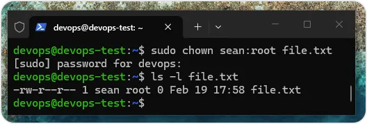 chown 命令可以更改文件拥有者的用户或群组,我们需要使用 sudo 命令来执行 chown 命令,如下所示:$ sudo chown sean:root file.txt