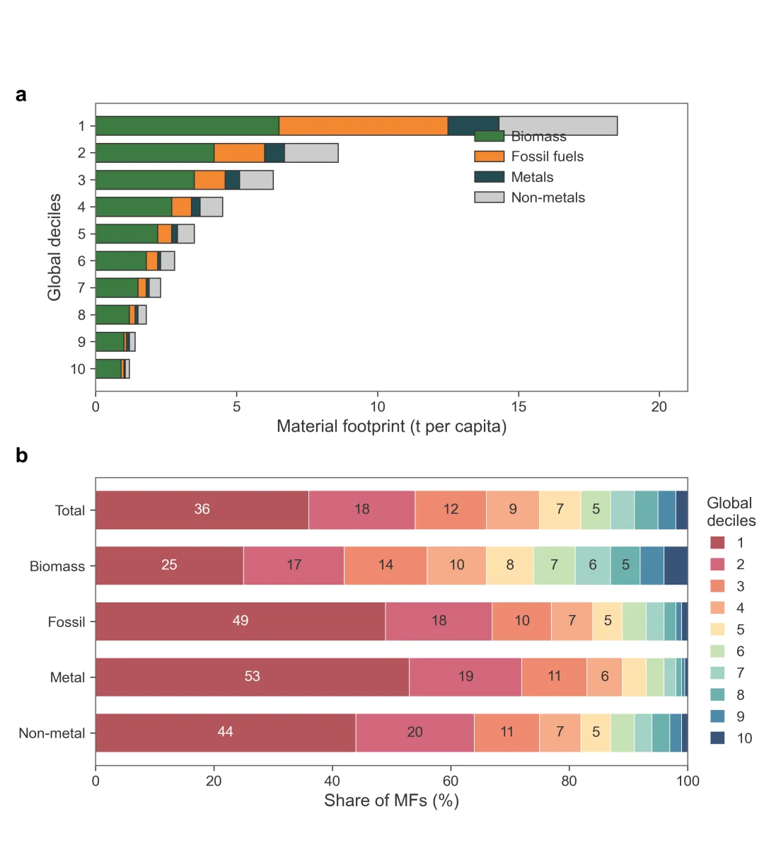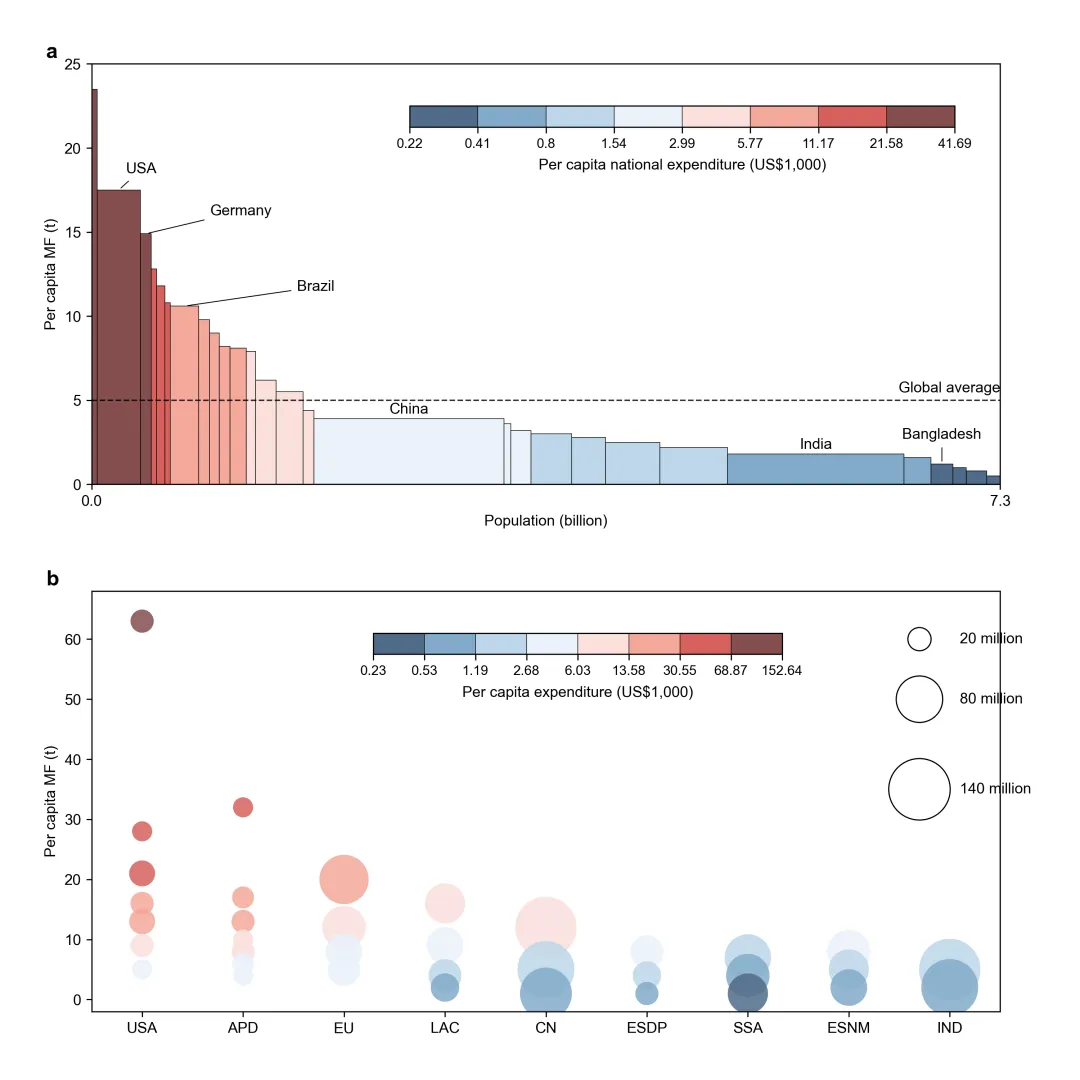 这篇研究通过极其详尽的全球支出数据结合多区域投入产出模型,量化了168个国家/地区家庭物质足迹(Material Footprints, MFs)的不平等情况,揭开了触目惊心的真相: