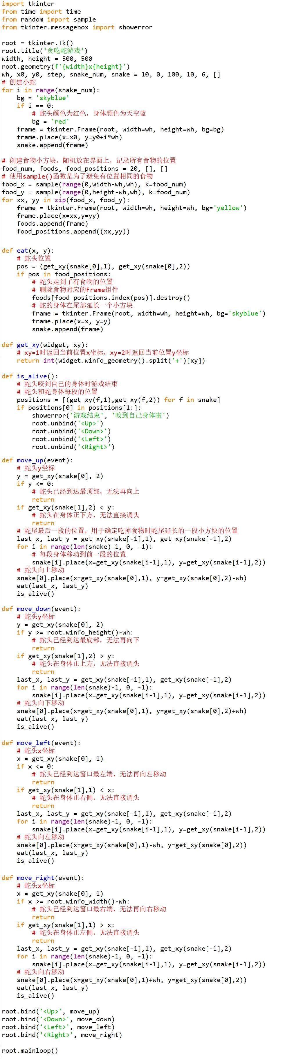 编写Python程序,使用tkinter设计界面,模拟贪吃蛇小游戏。通过上下左右方向键控制蛇的移动,吃到食物时延长蛇的身体,咬到自己身体时游戏结束。