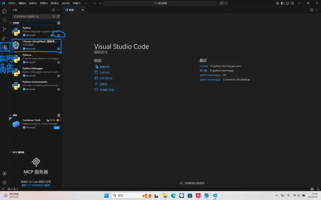 感想:我当时完全小白的时候,特别疑惑,在没有具体了解的情况下,我是以为直接建立了py文件之后就可以直接编译python文件了,实则相反。但好在,在我知道要建立py文件之后,后面VScode自动识别文件类型给我推荐要下载的插件和解释器。不放心的同志可以事先在应用商店搜索python,进行下载。当然,如果在下载前搜索一些下载视频教程观看,更加能保证下载进程的完整性。以此类推,其他编程语言也可以用这个方法。