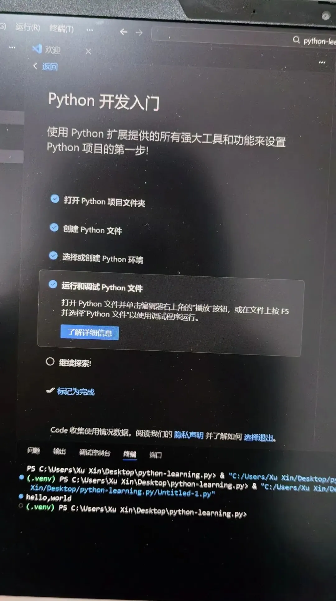 但一般在VScode侧边栏建文件时直接将文件名后面加上.py,这是最常见的源码后缀,再建立后这个文件后,编译器会直接匹配事先下载好的python插件和解释器。我们会在电脑文件中发现名为.venv的文件,这是一个虚拟环境,但文件真实存在,所以不能卸载这个文件,里面装的是独立的python解释器和独立的库。