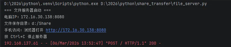 (文件接收服务器的作用:接收手机上传的文件,自动保存到指定目录)上述代码中,注意先要在你电脑中建立一个目录用于存放手机上传文件,比如d:\share。程序执行后,建立了文件服务器,等待手机端传送数据:2.3 手机端编写批量上传脚本