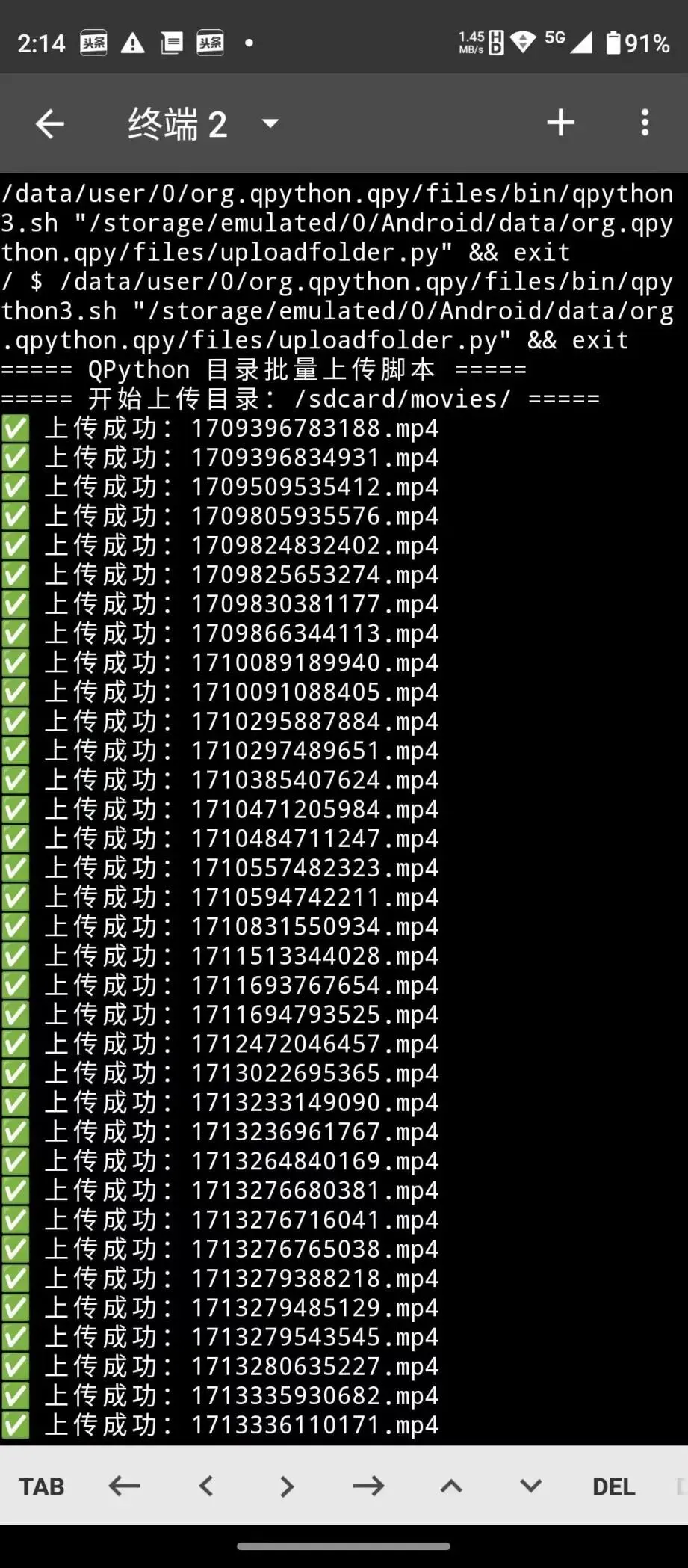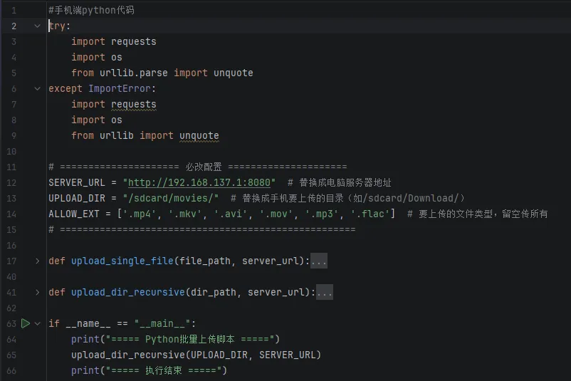 1.打开 QPython → 编辑器 → 新建文件,命名为 upload_dir.py- SERVER_URL:替换成电脑服务器显示的 IP + 端口