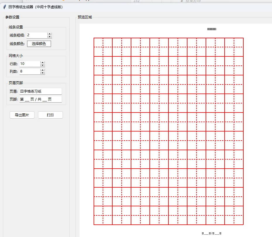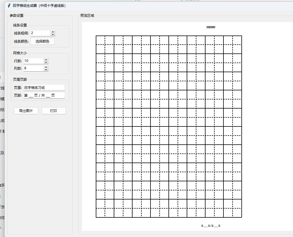 用 Python 的 Tkinter 库实现一个功能完整的田字格纸模板工具,这个工具需要包含左侧的参数设置面板和右侧的预览区域,支持调整田字格的线条样式、颜色、粗细,配置页眉页脚,还能导出图片和打印。
