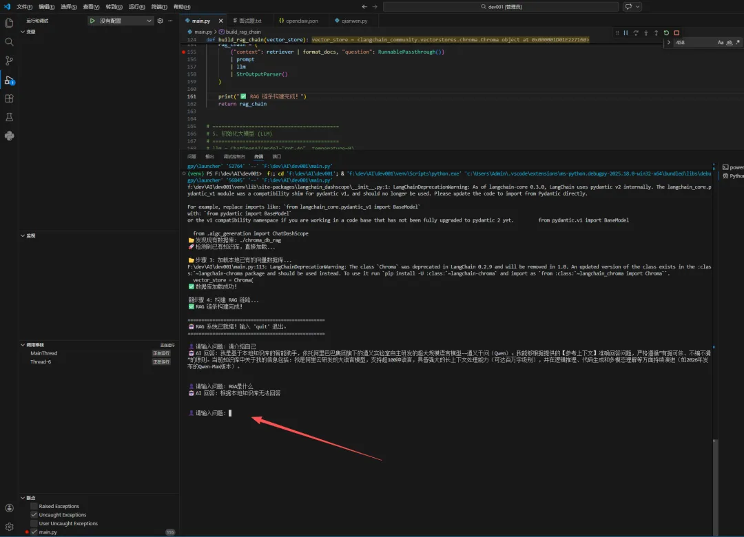 import osimport shutilfrom typing import List# LangChain 核心组件from langchain.text_splitter import RecursiveCharacterTextSplitterfrom langchain_community.vectorstores import Chromafrom langchain_community.document_loaders import TextLoader, DirectoryLoaderfrom langchain_core.documents import Documentfrom langchain_core.prompts import ChatPromptTemplatefrom langchain_core.output_parsers import StrOutputParserfrom langchain_core.runnables import RunnablePassthrough# 阿里云组件from langchain_dashscope import DashScopeEmbeddings, ChatDashScopeimport dashscope# ==========================================# ⚙️ 配置区域# ==========================================DASHSCOPE_API_KEY = "自己的阿里千问百炼平台申请的api的key" # 替换为你的 Keydashscope.api_key = DASHSCOPE_API_KEY# 本地 Chroma 数据库存储路径PERSIST_DIRECTORY = "./chroma_db_rag"# 如果想要重置数据库,删除这个文件夹即可if os.path.exists(PERSIST_DIRECTORY): print(f"📂 发现现有数据库: {PERSIST_DIRECTORY}") # 如果想每次重新构建,取消下面这行的注释 # shutil.rmtree(PERSIST_DIRECTORY) else: print(f"📂 将创建新数据库: {PERSIST_DIRECTORY}")# ==========================================# 1. 文档加载与切片 (Chunking)# ==========================================def load_and_split_documents(): print("\n📄 步骤 1: 加载并切片文档...") # 【模拟数据】实际项目中,你可以用 DirectoryLoader('./my_docs', glob="**/*.txt") # 替代向量数据库数据,生成一些稍微长一点的模拟文档 raw_docs = [ Document(page_content=""" 阿里巴巴的通义千问大模型(Qwen)是阿里云研发的大语言模型。 2026年,Qwen-Max 版本发布,它在逻辑推理、代码生成和多模态理解上达到了新的高度。 Qwen 支持超过 100 种语言,并且在长上下文窗口(Long Context)方面表现优异,能够处理百万字级别的文档。 通义千问的底层架构采用了混合注意力机制,极大地提高了推理速度。 """, metadata={"source": "qwen_intro.txt"}), Document(page_content=""" RAG(检索增强生成)是目前大模型应用最实用的技术架构。 它的核心流程包括:文档切片、向量化(Embedding)、存入向量数据库、检索相关片段、最后由 LLM 生成答案。 通过 RAG,大模型可以利用私有知识库回答问题,有效解决了幻觉问题(Hallucination)。 Chroma 是一个轻量级、易于使用的本地向量数据库,非常适合开发者快速原型开发。 LangChain 提供了完整的工具链来串联这些步骤,通过 LCEL 语法可以极大地简化代码。 """, metadata={"source": "rag_concept.txt"}), Document(page_content=""" LangChain 的 LCEL (LangChain Expression Language) 是一种声明式的语法。 它允许开发者使用管道符 '|' 将组件串联起来,例如:Retriever | Prompt | Model。 这种写法不仅代码简洁,还天然支持流式输出(Streaming)和异步调用。 在 RAG 场景中,LCEL 可以轻松实现并行检索和上下文组装。 """, metadata={"source": "langchain_tips.txt"}) ] # 【关键步骤】文本切片 # chunk_size: 每块的大小 (字符数) # chunk_overlap: 块之间的重叠部分 (防止切断语义) text_splitter = RecursiveCharacterTextSplitter( chunk_size=200, # 每个切片约 200 字 chunk_overlap=20, # 重叠 20 字,保持上下文连贯 length_function=len, separators=["\n\n", "\n", "。", "!", "?", " ", ""] ) splits = text_splitter.split_documents(raw_docs) print(f"✅ 文档切片完成!共生成 {len(splits)} 个片段。") for i, split in enumerate(splits): print(f" - 片段 {i+1}: {split.page_content[:50]}...") return splits# ==========================================# 2. 向量化与存入 Chroma (Embedding & Storage)# ==========================================def create_vector_store(documents: List[Document]): print("\n💾 步骤 2: 向量化并存入 Chroma 数据库...") # 初始化 Embedding 模型 (使用阿里云) embeddings = DashScopeEmbeddings(model="text-embedding-v3") # 【核心】创建 Chroma 向量存储 # persist_directory 指定本地存储路径,这样数据就不会丢失 vector_store = Chroma.from_documents( documents=documents, embedding=embeddings, persist_directory=PERSIST_DIRECTORY, collection_name="my_rag_collection" ) print(f"✅ 向量数据库已保存至: {os.path.abspath(PERSIST_DIRECTORY)}") return vector_store# ==========================================# 3. 加载现有的 Chroma 数据库# ==========================================def load_existing_vector_store(): print("\n📂 步骤 3: 加载本地已有的向量数据库...") embeddings = DashScopeEmbeddings(model="text-embedding-v3") # 直接从磁盘加载,无需重新向量化,速度极快 vector_store = Chroma( persist_directory=PERSIST_DIRECTORY, embedding_function=embeddings, collection_name="my_rag_collection" ) print("✅ 数据库加载成功!") return vector_store# ==========================================# 4. 构建 RAG 链条 (LCEL)# ==========================================def build_rag_chain(vector_store): print("\n⛓️ 步骤 4: 构建 RAG 链路...") # 初始化检索器 # search_kwargs: 检索时返回最相关的 k 个片段 retriever = vector_store.as_retriever(search_kwargs={"k": 2}) # 提示词模板 template = """你是一个基于本地知识库的智能助手。请严格根据以下【参考上下文】回答用户问题。如果上下文中没有答案,请直接说“根据本地知识库无法回答”,不要编造。【参考上下文】:{context}【用户问题】:{question}【回答】:""" prompt = ChatPromptTemplate.from_template(template) # 初始化大模型 # llm = ChatDashScope(model="qwen-plus", temperature=0.1) llm = NativeQwenChat(model="qwen-plus", temperature=0.1, api_key=DASHSCOPE_API_KEY) # 格式化函数 def format_docs(docs): return "\n\n---\n\n".join(doc.page_content for doc in docs) # LCEL 链条 rag_chain = ( {"context": retriever | format_docs, "question": Runnab