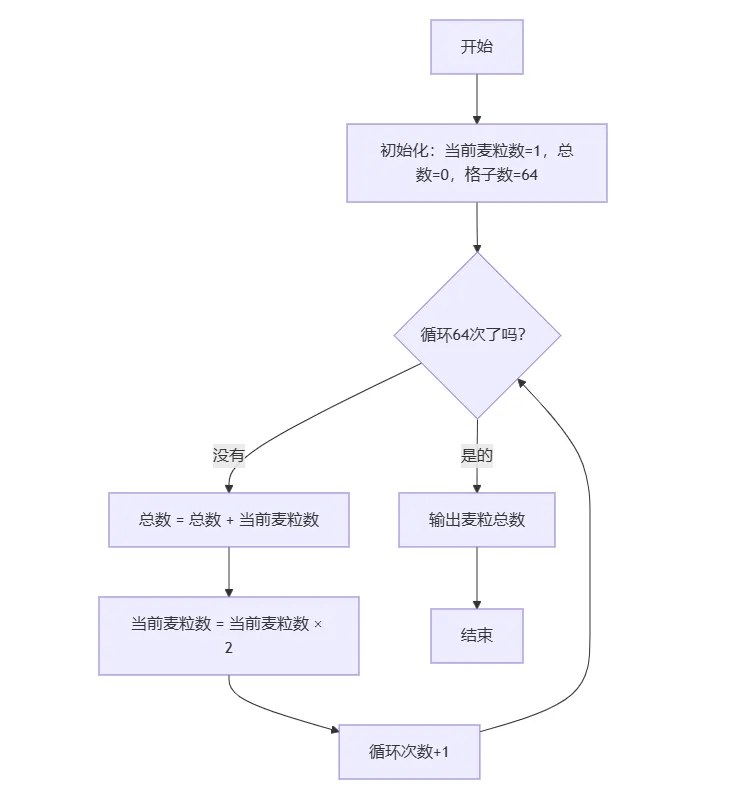 # 少儿Python循环结构实战:国王的麦粒难题(for循环版)# 背景:计算国际象棋64个格子的麦粒总数,每个格子是前一个的2倍# 初始化小盒子:当前麦粒数(第1格是1颗)、麦粒总数(刚开始为0)current_wheat = 1 # 当前格子的麦粒数total_wheat = 0 # 麦粒总数# for循环:循环64次(遍历1到64,代表64个格子)for grid inrange(1, 65): # range(1,65)表示从1到64,不包含65哦 total_wheat = total_wheat + current_wheat # 把当前格子的麦粒加到总数里 current_wheat = current_wheat * 2 # 当前麦粒数翻一倍,准备下一个格子# 输出结果(用逗号分隔,让数字更易读)print("64个格子的麦粒总数是:", format(total_wheat, ","))