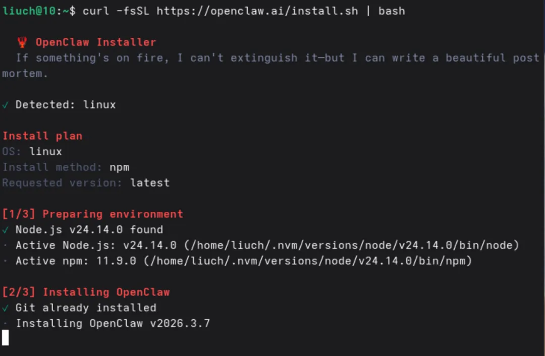 curl -fsSL https://openclaw.ai/install.sh | bash这条命令会自动完成(耗时可能较长,耐心等待):