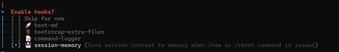 下一步会问是否启用 Hooks(钩子插件),可选 session-memory,让 AI 记住历史上下文: