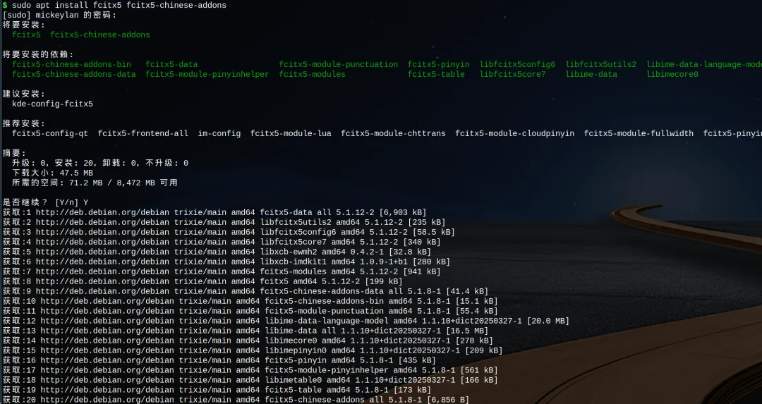 fcitx5 —— 输入法框架(基础程序)fcitx5-chinese-addons —— 中文输入组件(包含拼音、五笔、双拼等)fcitx5-config-qt —— 图形配置工具(必须安装!否则无法添加五笔等输入法)按提示输入 Y 确认安装。