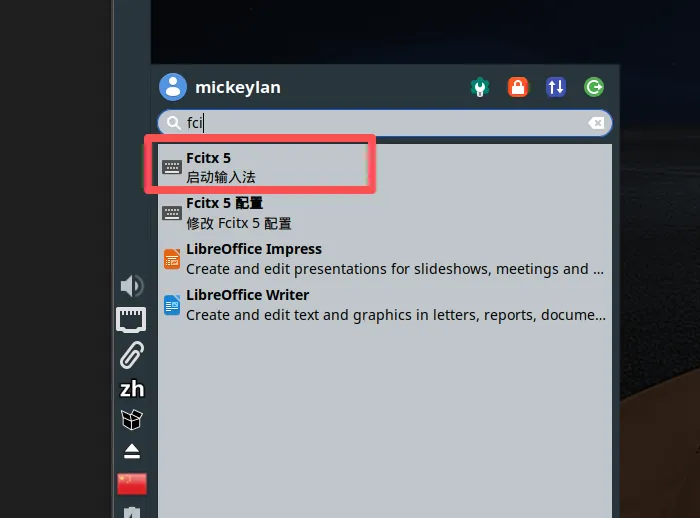 sudo reboot或者点击桌面右上角电源图标,选择「重启」。重启后启动输入法:
